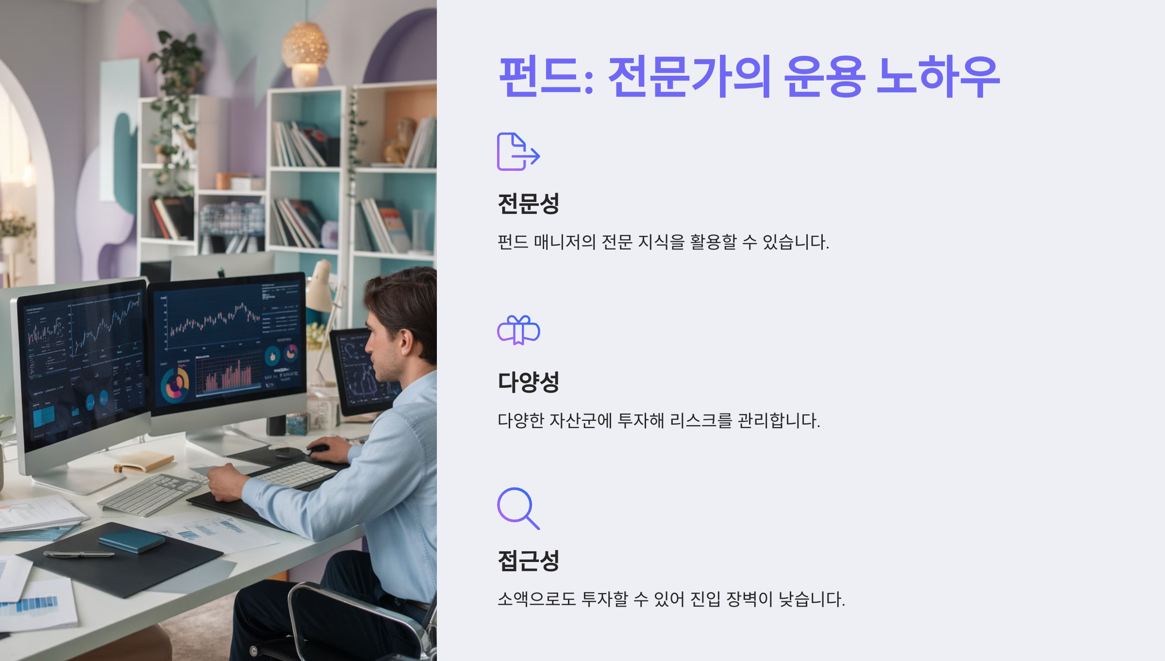 | 전문가 관리를 원할 때 | 펀드 | 전문가의 자산 운용으로 투자 전략을 효과적으로 실행할 수 있습니다. |