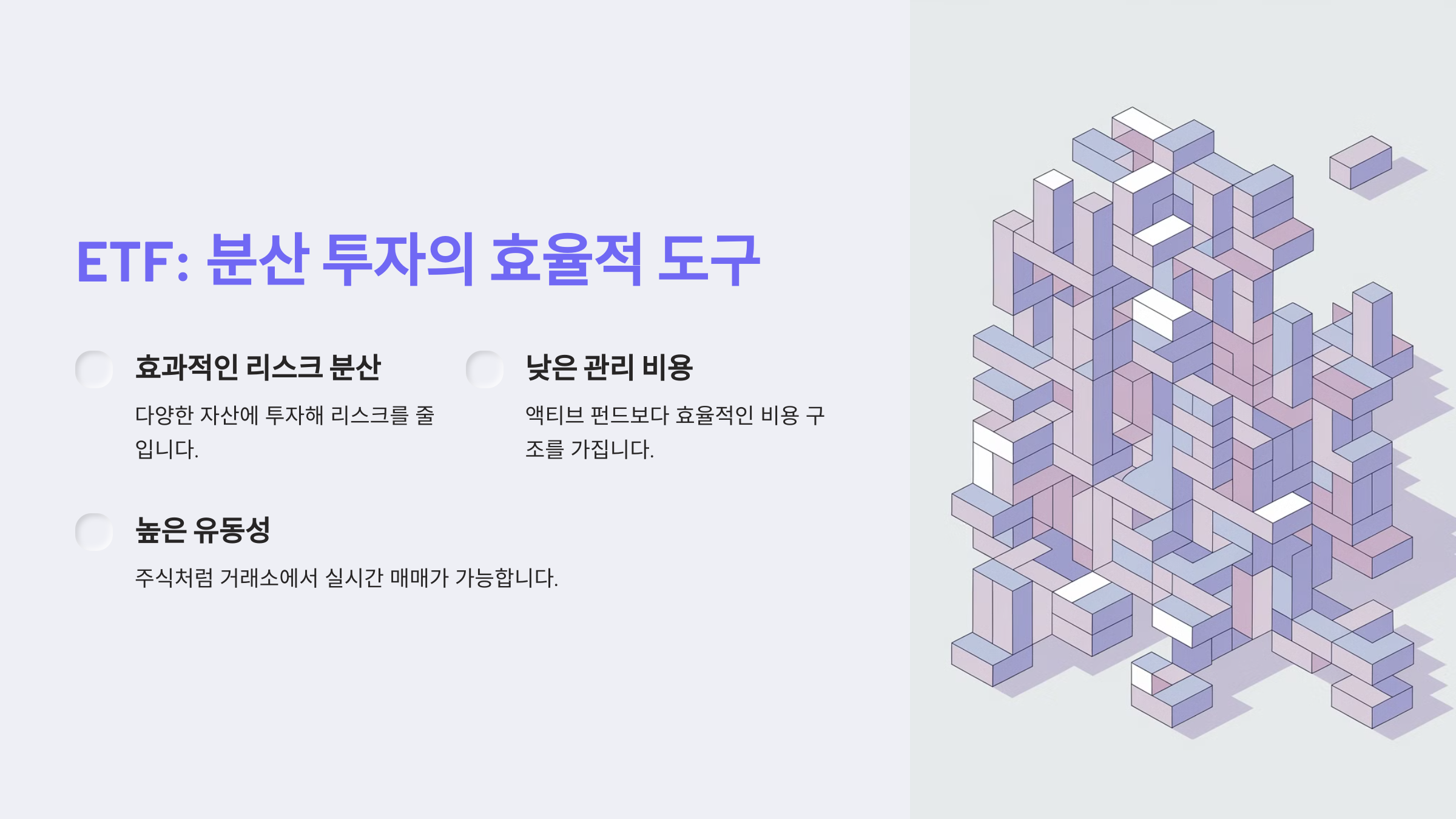 | 안정성을 원할 때 | ETF | 분산 투자와 낮은 변동성으로 리스크를 줄일 수 있습니다. |